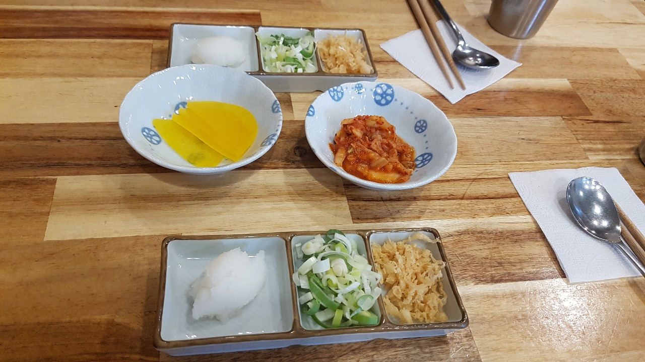 초기 세팅입니다. 김치는 국산이었으면 좋겠으나 중국산 같습니다. 단무지와 같이 나옵니다.