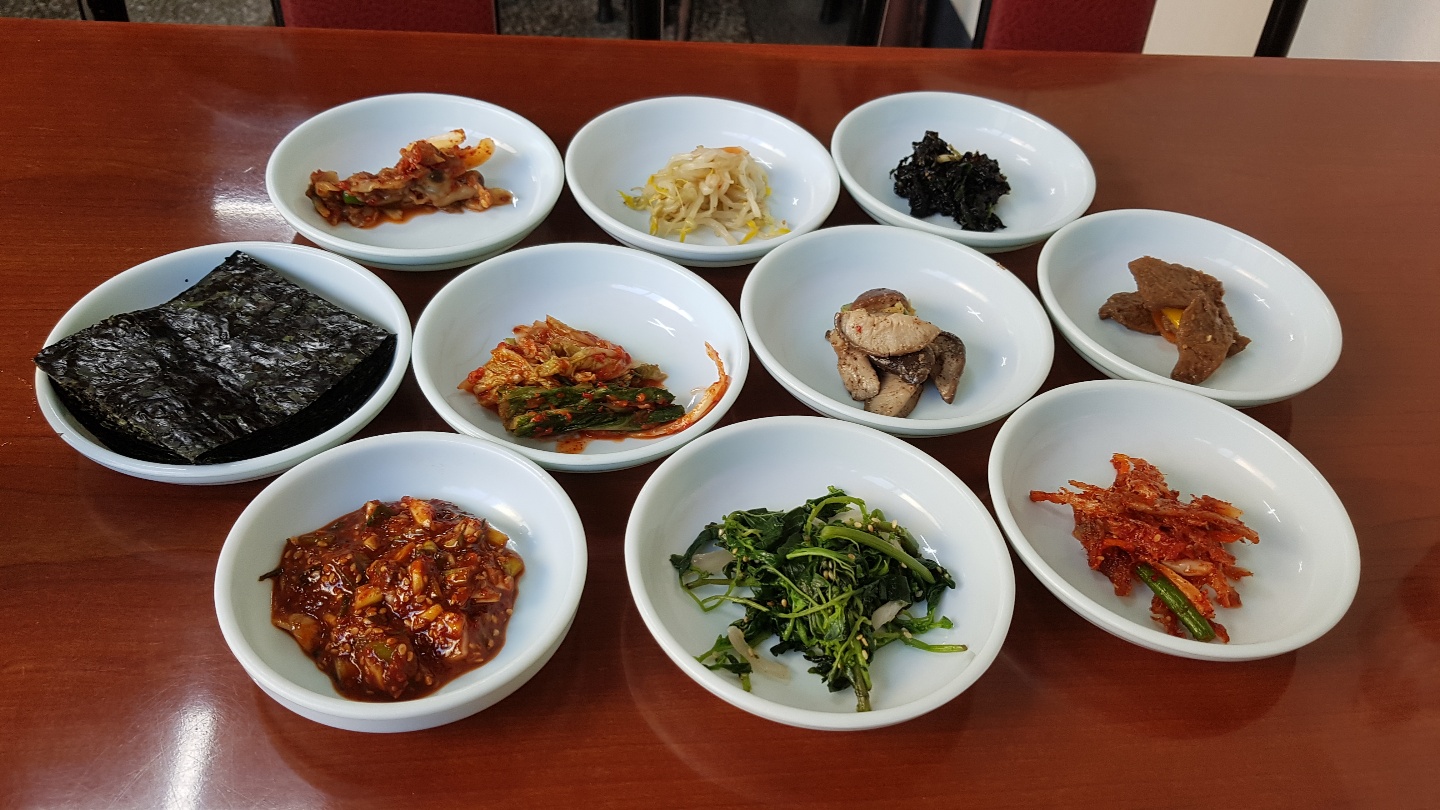 가장 먼저 나온 반찬입니다. 반찬이 정성스러웠습니다. 가장 위부터 조개젓, 콩나물무침, 김무침, 김구이 등 10가지 반찬이 맞이하여 줍니다.