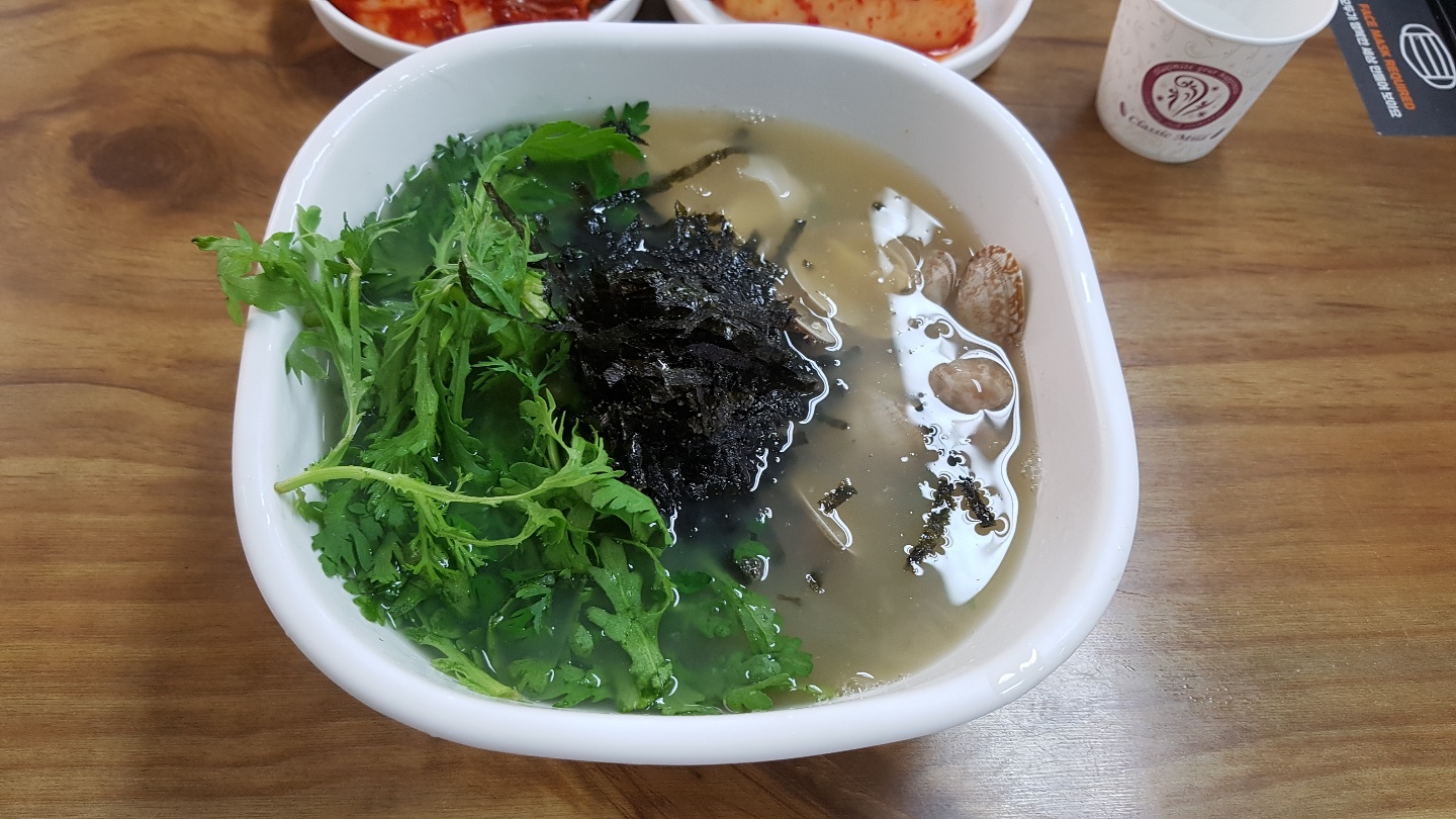 오늘의 주인공 칼국수 입니다. 저는 쑥갓을 좋아하는데 얹어져서 나왔습니다. 옆에 바지락도 보이시나요? 국물도 정말 좋습니다. 그리고 생각보다 양이 많습니다. 한참 칼국수를 건져서 먹었습니다.