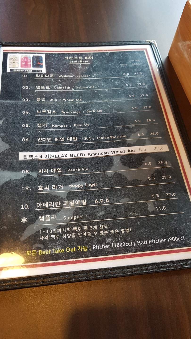 자리 잡고 앉아서 먼저 맥주 메뉴를 보았습니다. 저는 3번 올린을 주문하였습니다.