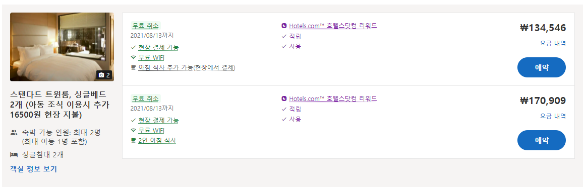 저는 호텔스닷컴에서 예약을 했습니다. 지금 보여지는 가격보다 약간 더 저렴하였는데 스탠다드 트윈룸의 가격이 조금 더 저렴하여 예약을 해 보았습니다.