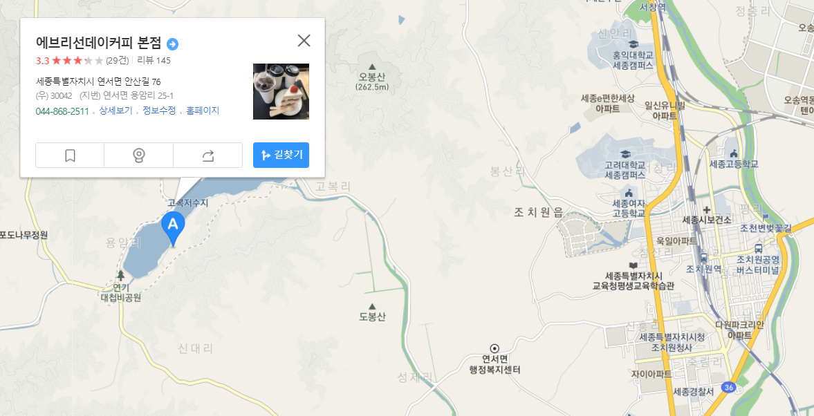 에브리선데이는 체인점 같아 보이더군요, 평점도 비슷합니다. 고복저수지 근처에서 커피를 즐기고 싶다면 에브리선데이커피 본점으로 찾아오시면 됩니다.