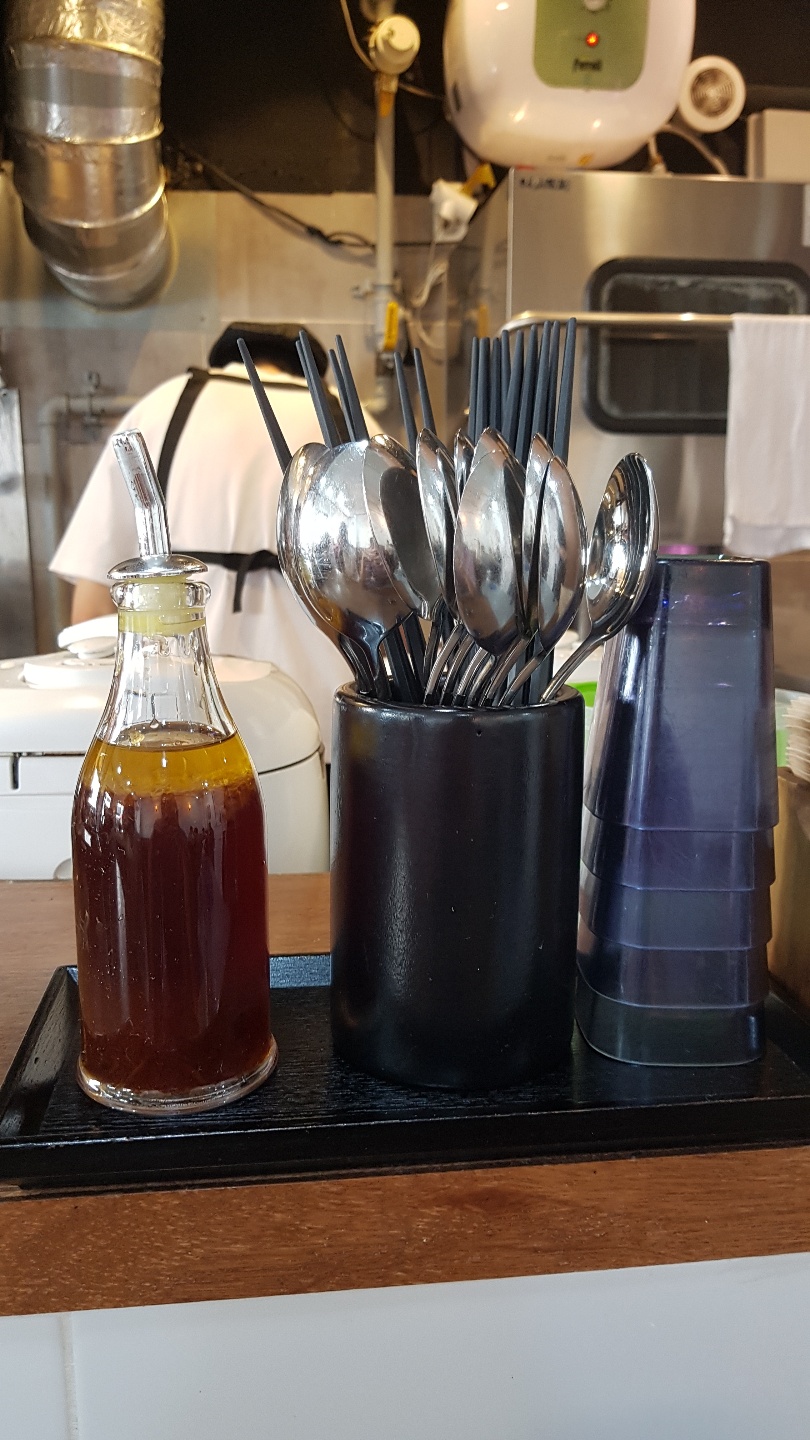 저는 테이블로 안내를 받았습니다. 테이블 위에는 돈까스 소스와 식기도구가 맞이하여 주더군요.