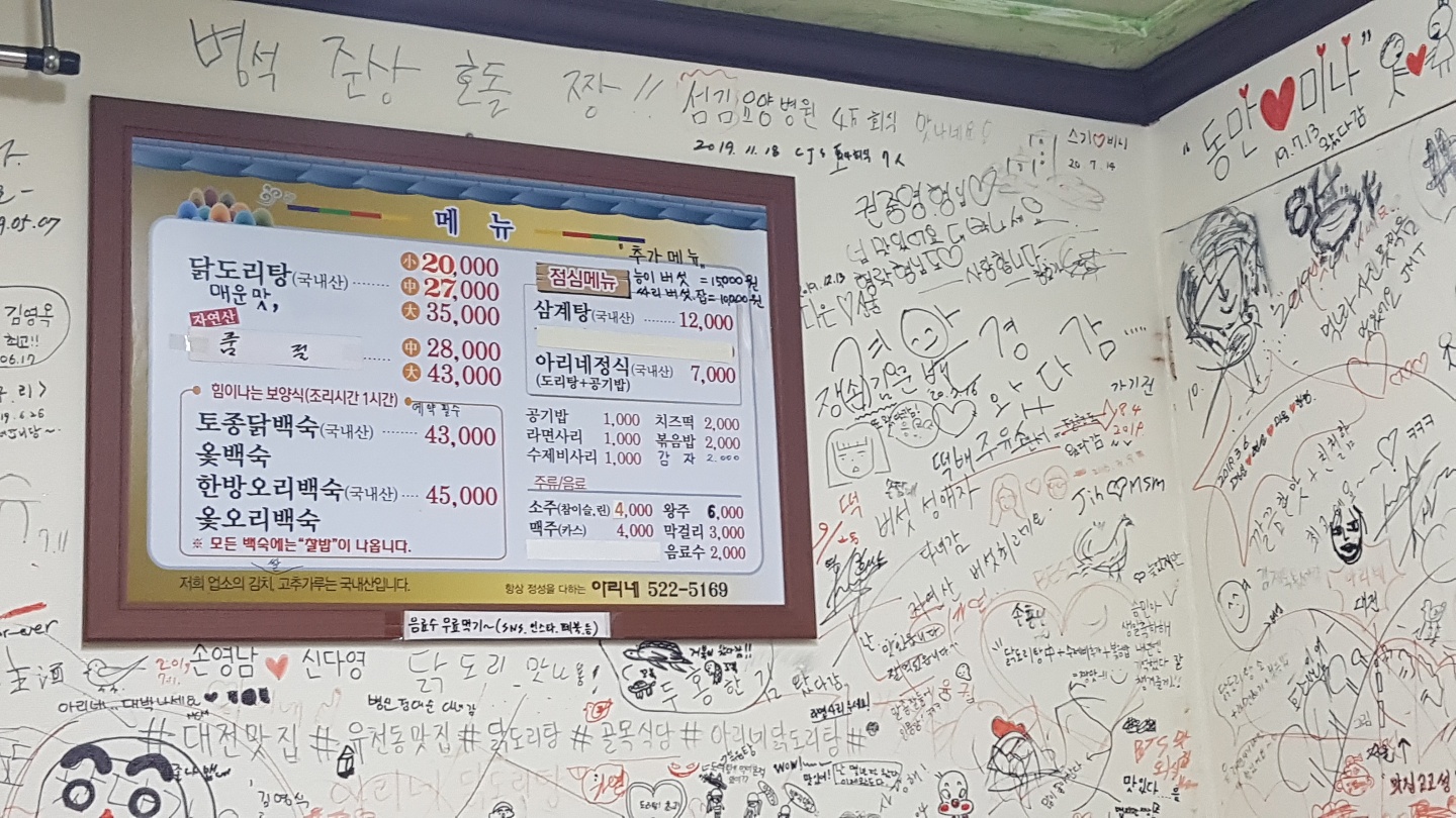 저희는 2인이 찾아갔는데 중자 27,000원 닭도리탕을 주문 했습니다. 낙서를 보시면 많은 분들이 찾아 갔다는 것을 확인하실 수 있습니다 ㅎㅎ