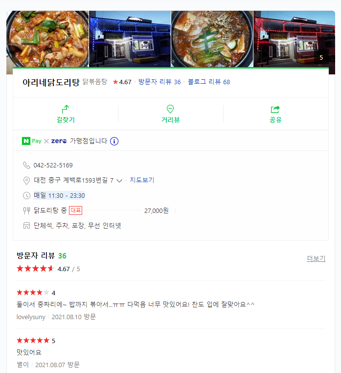 오늘은 네이버 평점이 좋았던 닭도리탕 집을 찾아간 후기입니다. 대전시 중구에 위치한 아리네는 서대전역에서 멀지 않습니다.
