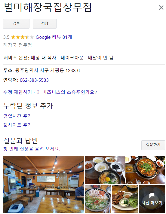 구글에서는 별미해장국집상무점으로 등록이 되어 있습니다. 평점은 3.5점 정도이네요 ㅎㅎ