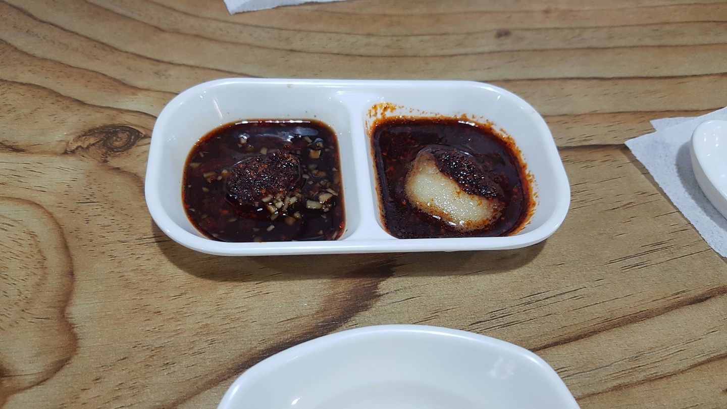 가장 먼저 나온 것은 찍어 먹는 소스입니다. 하나는 생강이 들어있고, 다른 하나는 다진 마늘이 들어가있습니다. 이 소스들이 정말 톡톡 역할을 합니다.