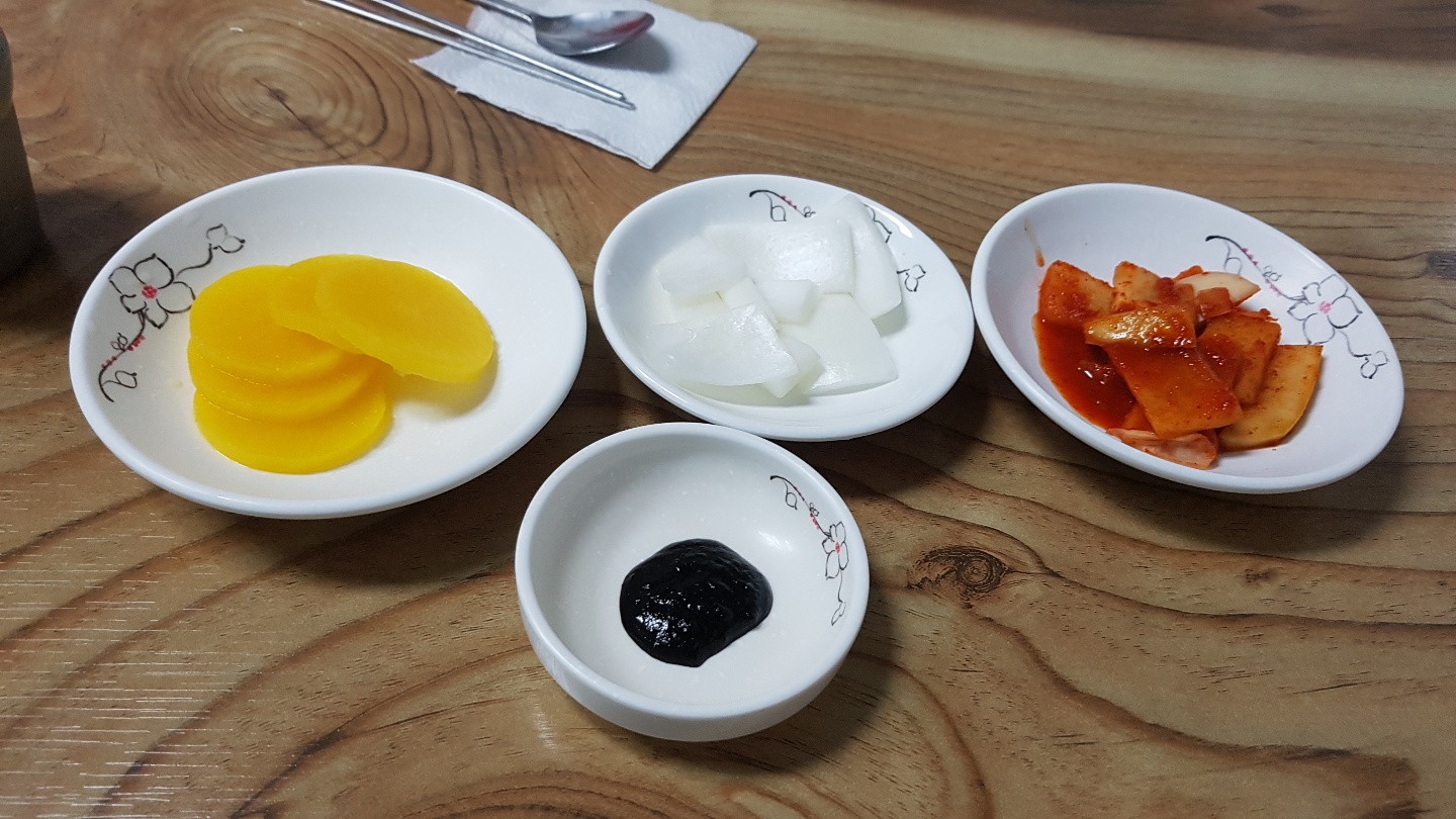 처음 식당에 차려진 단무지와 양파 그리고 깍두기 입니다. 깍두기 맛이 괜찮았네요.